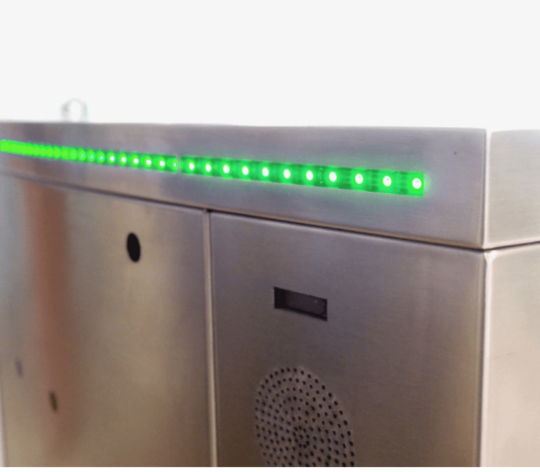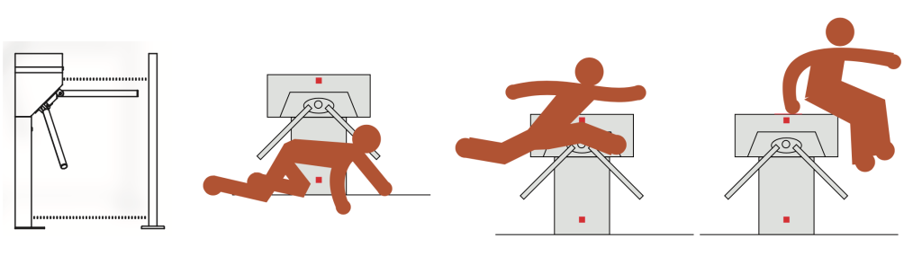 - Entry under the arms. The turnstile is equipped with a system of photocells that detect unauthorized entry under the tripod arms. The system detects the presence of the person passing below the arms and emits an acoustic alarm.