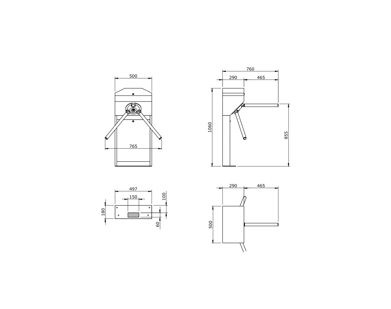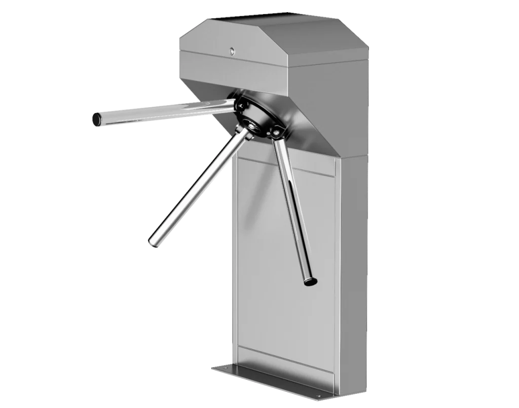 Waist-height turnstile formed by a cabinet that supports a tripod arm set. It controls the acces by rotating an arm, which is pushed by the user and at each 120o turn, allows the passage of one person at a time, with one of the arms always remaining in the closed position. This model is efective at managing large crowds and suitable for both indoors and outdoors installations with some level of supervision.