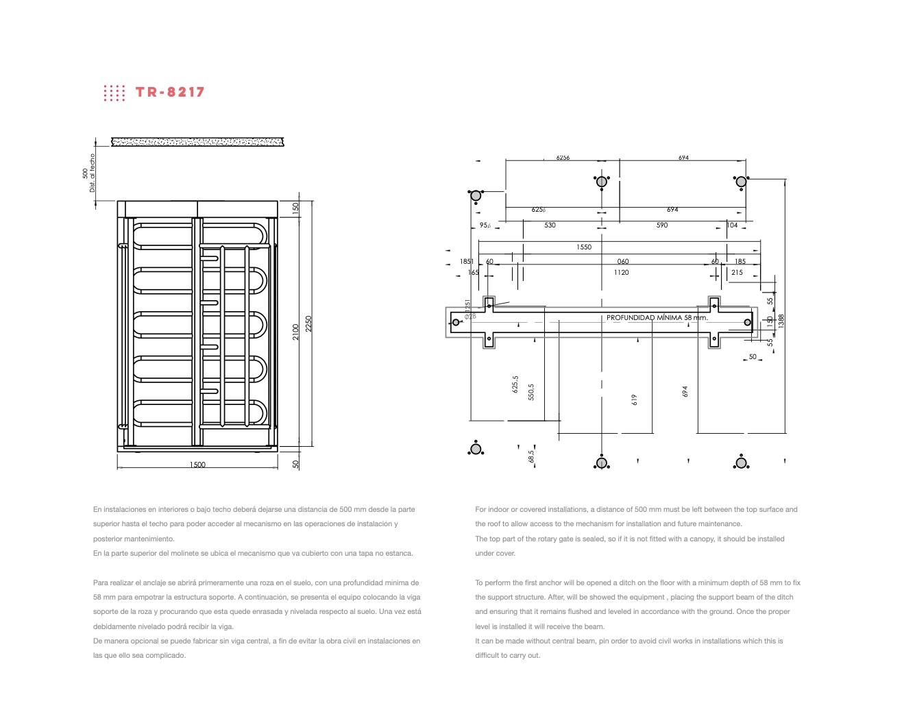 In indoor installations or in installations where the ceilling is not very height, a distance of 500 mm must be taken into account from the top of the full height turnstile to the ceiling to allow access to the mechanism for installation and subsequent maintenance.