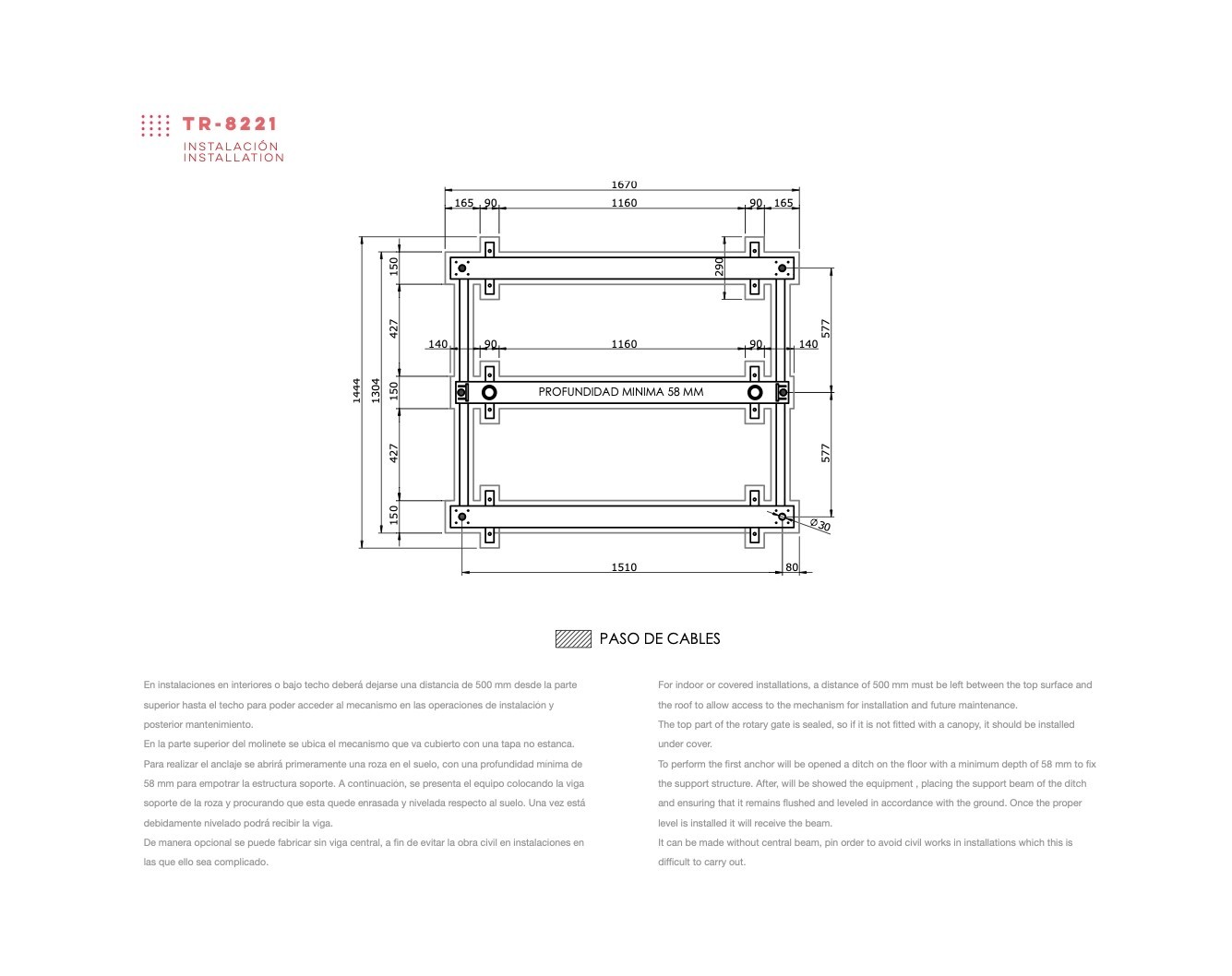 In indoor installations or in installations where the ceilling is not very height, a distance of 500 mm must be taken into account from the top of the full height turnstile to the ceiling to allow access to the mechanism for installation and subsequent maintenance.