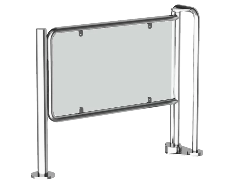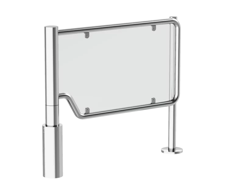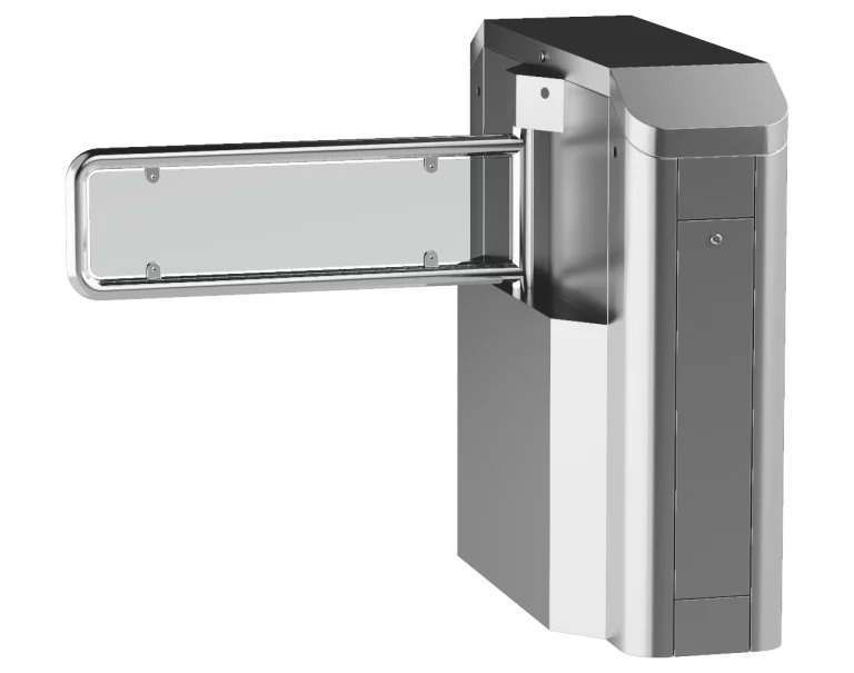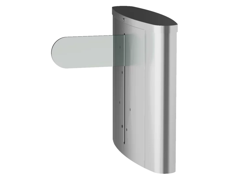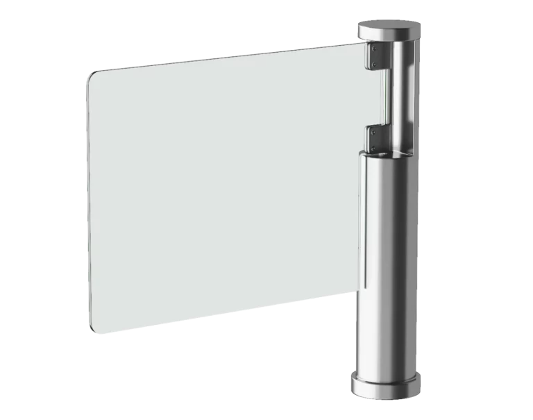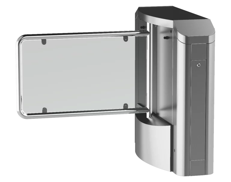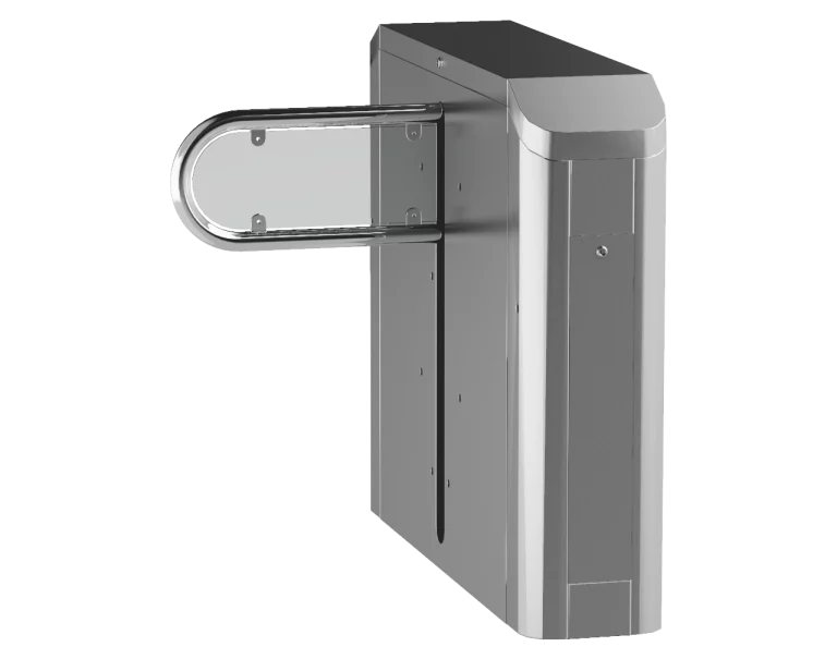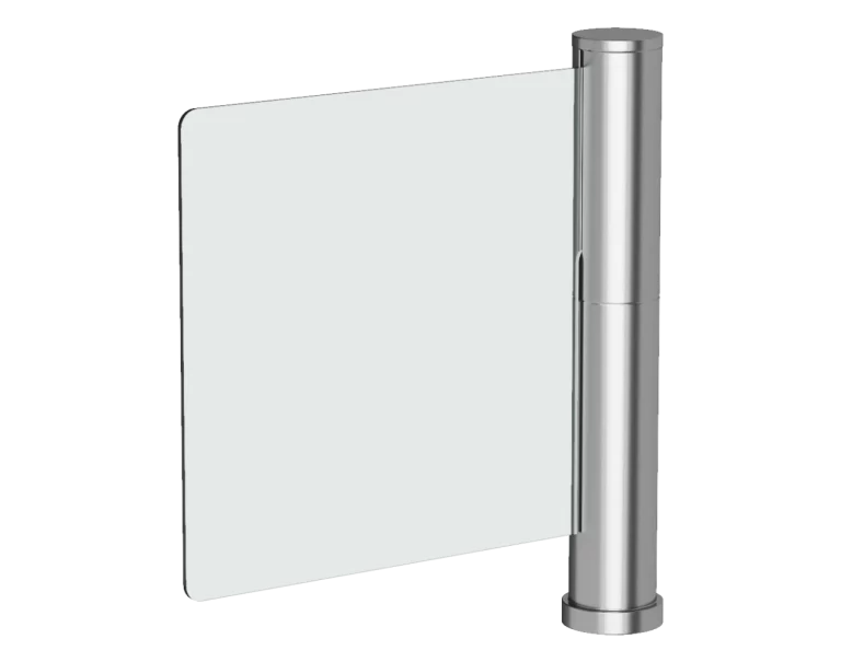 Half-height turnstile with motorized stainless steel rotating arm and 3 panels. Tempered glass panels.