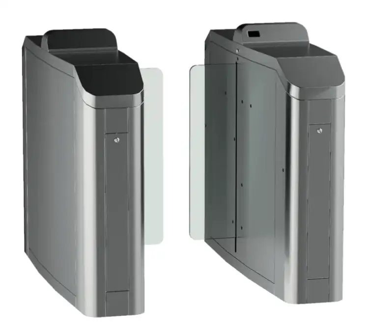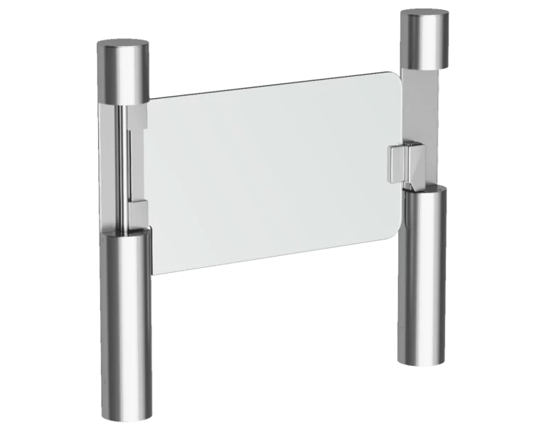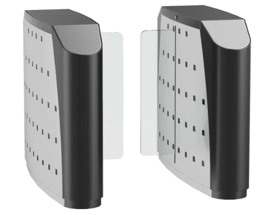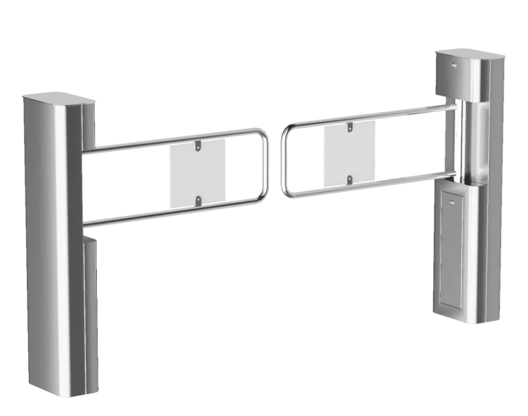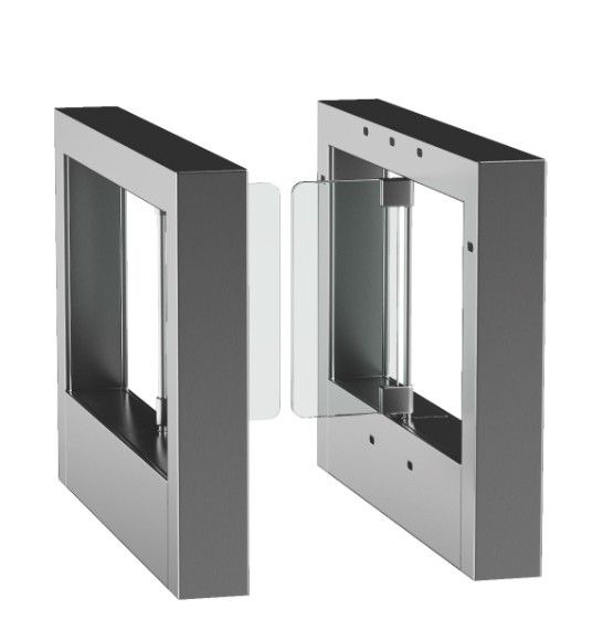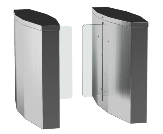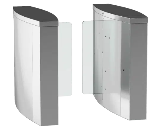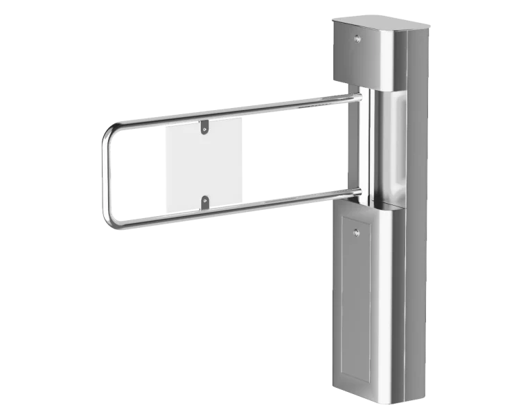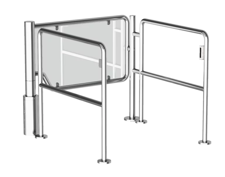 Half-height turnstile with motorized stainless steel rotating arm and 3 panels. Tempered glass panels.