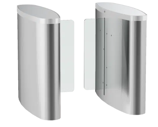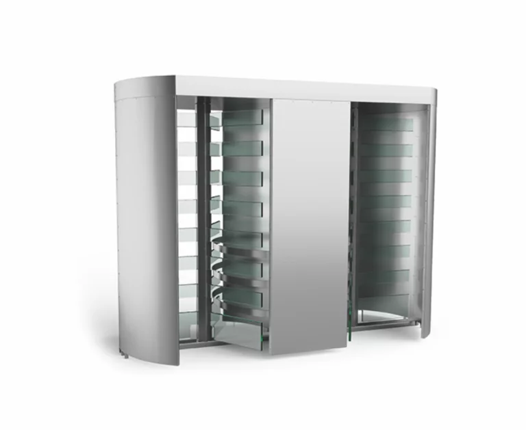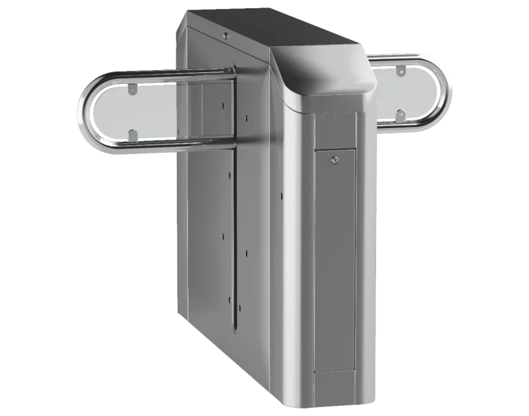 Double rotating turnstile, elegant and functional model with stainless steel rotating arm with 3 acrylic and aluminum blades; controls access to perimeter entrances and exits.