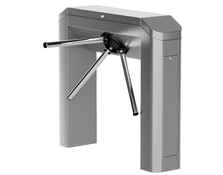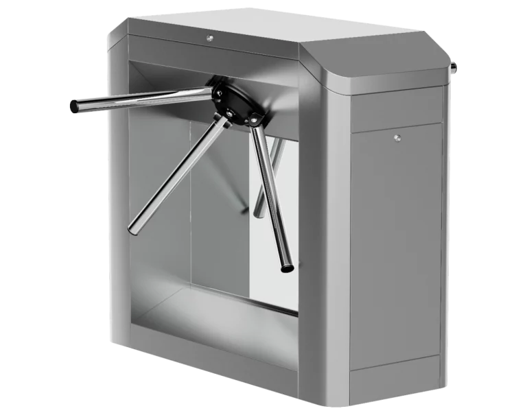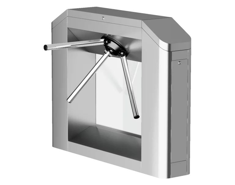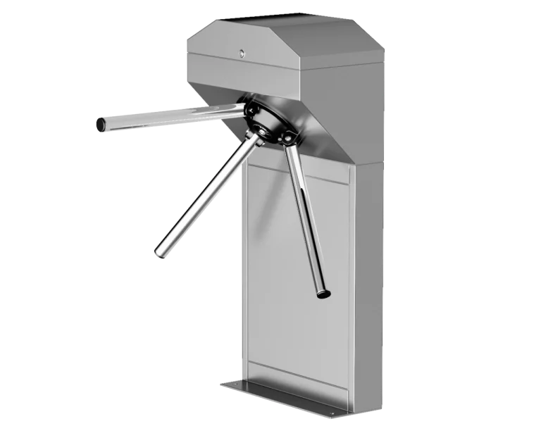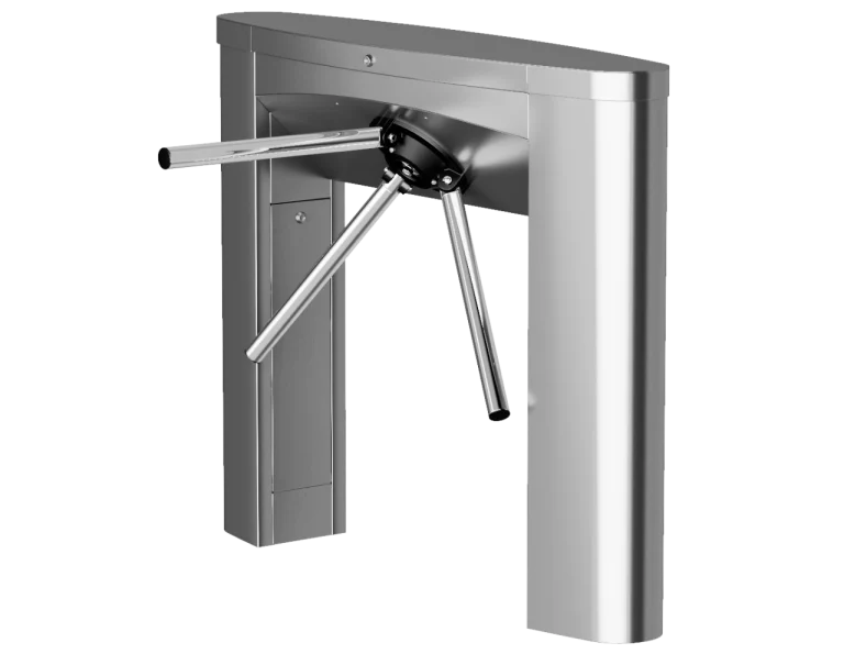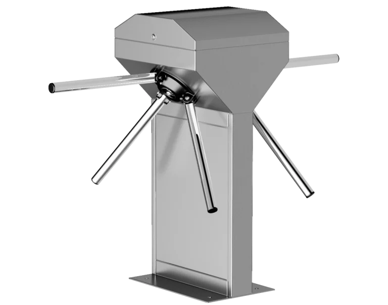 Half-height turnstile consisting of a cabinet supporting a tripod arm. Controls passage in both directions.