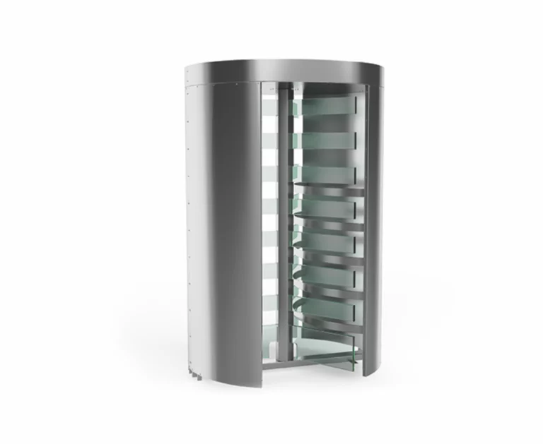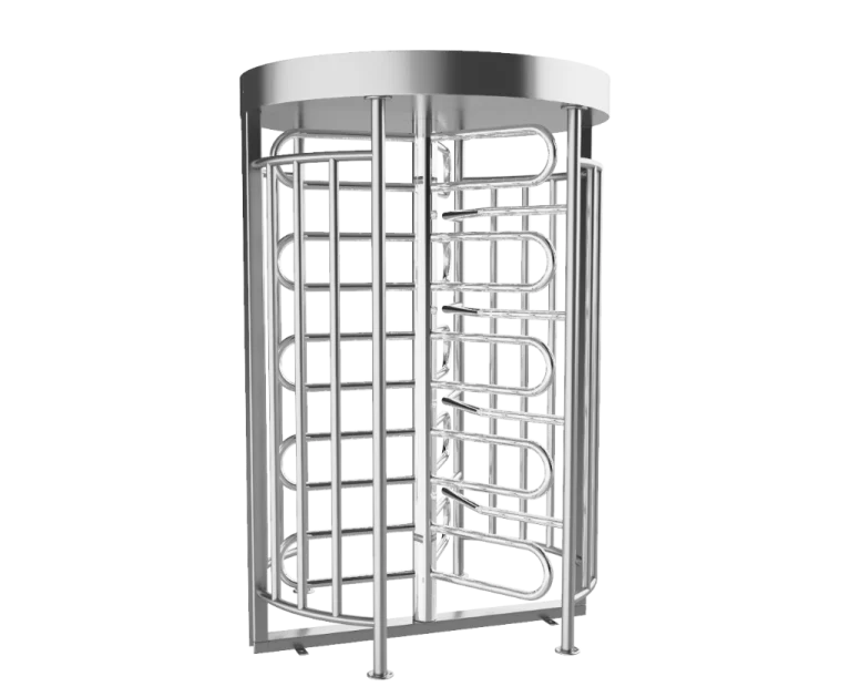 Full-height turnstile formed by an enclosing structure housing a rotating arm with blades moved by the user. Controls access to perimeter entrances and exits.