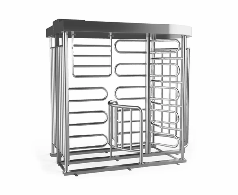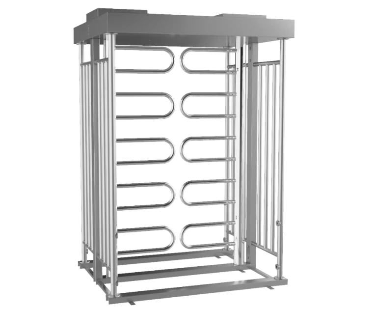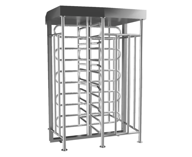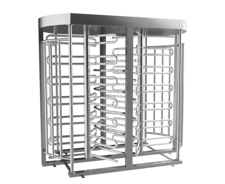 Double full-height turnstile formed by an enclosing structure housing a rotating arm with blades moved by the user. Controls access to perimeter entrances and exits.